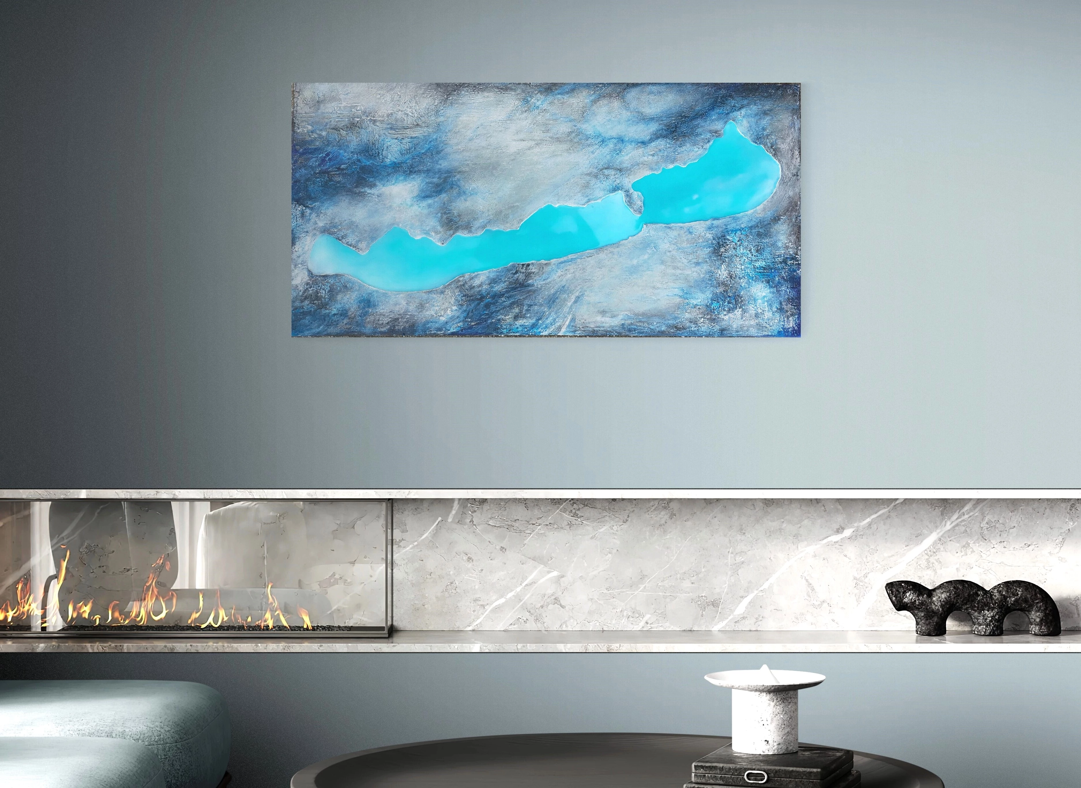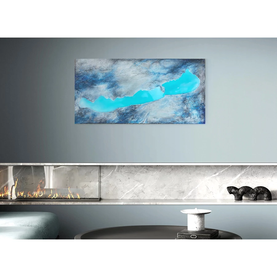 Ebben a modern faliképben a Balaton ikonikus formája kapott főszerepet, élénk, fénylő epoxigyantával kiemelve.